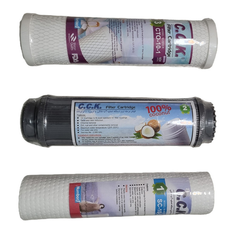 پک فیلتر 3 عددی فیلتر تصفیه کننده آب سیسیکا ساخته شده از کربن گیاهی پوسته نارگیل به عنوان فیلتر پیشتصفیه در دستگاه تصفیه کننده آب خانگی قرار میگیرد. فیلترهای سیسیکا از لحاظ اندازه بر پایه استانداردهای لازم طراحی شده اند، که قابلیت نصب بر انواع مدل و برند دستگاههای تصفیه آب خانگی را دارند علاوه بر بهبود عملکرد تصفیه، باعث افزایش طول عمر فیلتر ممبران میشود.این پک دارای 3 عدد فیلتر است. این فیلترها شامل فیلتر الیافی با تراکم بالا پلی پروپیلن، فیلتر کربن پودری و کربن بلاک گیاهی میباشد. وظیفهی فیلترهای پیشتصفیه حذف ذرات معلق در آب به قطر 1 الی 5 میکرون است. موارد فیلتر شونده عبارتند از: گلولای، شنوماسه، زنگ لوله، کلر، فلزات سنگین، جیوه، سرب و همچنین بوی بد و کدورت آب. این فیلترها، تمام نیازهای شما را برای داشتن آبی با کیفیت بالا و عاری از آلاینده برطرف می سازد. نکته مهم: در دستگاه های تصفیه آب با روش اسمز معکوس اگر فیلترهای پیش تصفیه کیفیت لازم را نداشته باشند؛ علاوه بر این که طول عمر آن ها بسیار کمتر از نمونه های با کیفیت است، بر عملکرد فیلتر ممبران که اصلی ترین فیلتر در سیستم اسمز معکوس است تاثیر منفی گذاشته و روند تصفیه آب با اختلال روبرو می شود.طول عمر مفید فیلتر در این نوع: فیلتر اول 3 ماه، فیلتر دوم و سوم 12 ماه میباشد.